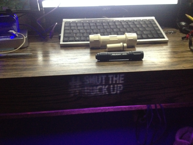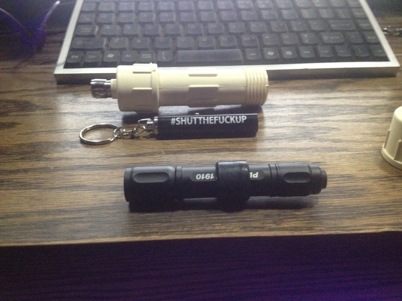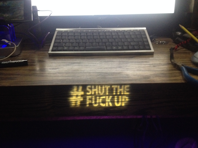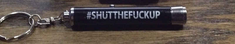 It's a little LED keychain with a lens that projects "#SHUT THE FUCK UP" on whatever.